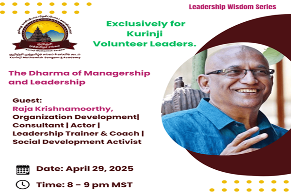 On October 12, 2025, the Kurinji Muthamizh Sangam & Academy hosted a wellness workshop titled “Eat Well! Breathe Well!” featuring Dr. Sundar Balasubramanian, a globally acclaimed Top 5 Breathing Expert and Author. The session highlighted the powerful link between mindful eating, conscious breathing, and holistic well-being. Dr. Balasubramanian’s blend of science and ancient yogic wisdom made the workshop both insightful and transformative for all attendees.